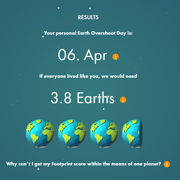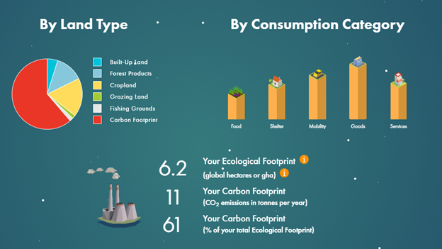 I tried a few free data resources/tools online, and preferred the Ecological Footprint Calculator from Global Footprint Network and the Climate Footprint Calculator from Nos Gestes Climat. Both have great visual representations and are relatively easy to use, although they are also different in some ways and each has its own advantages. Here is a key comparison: