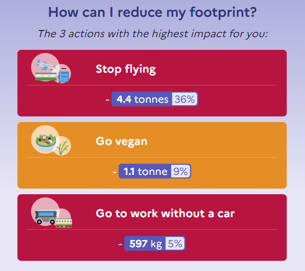 The other two top actions recommended that could significantly reduce my carbon footprint includes becoming a vegan and go to work by public transport.